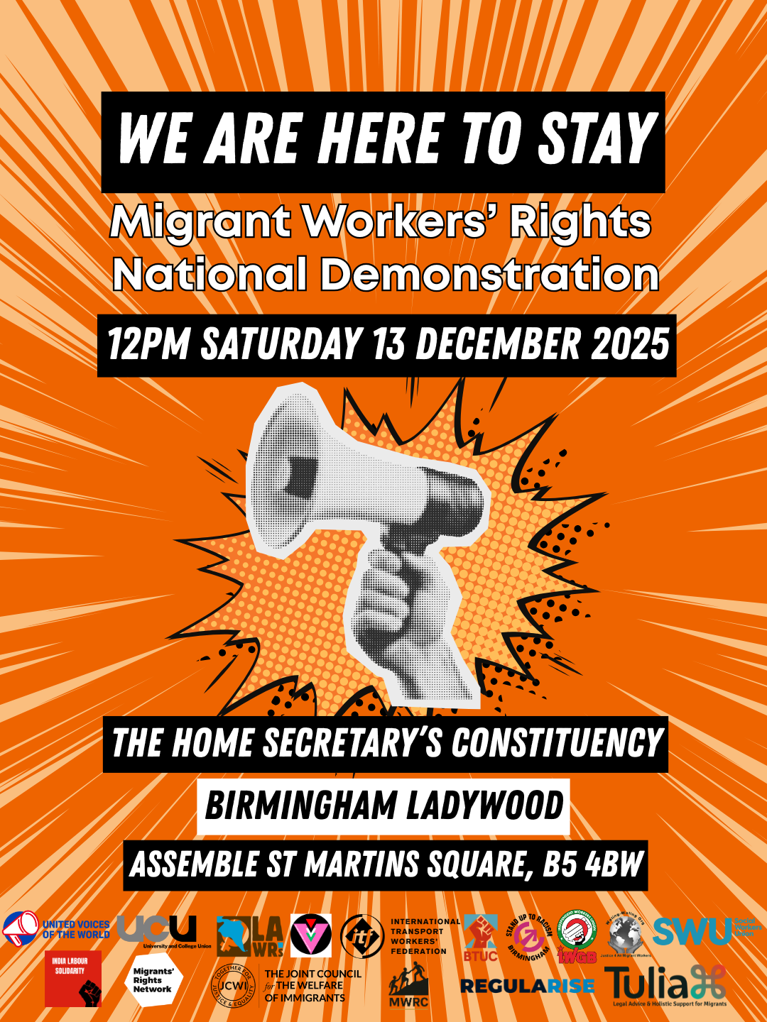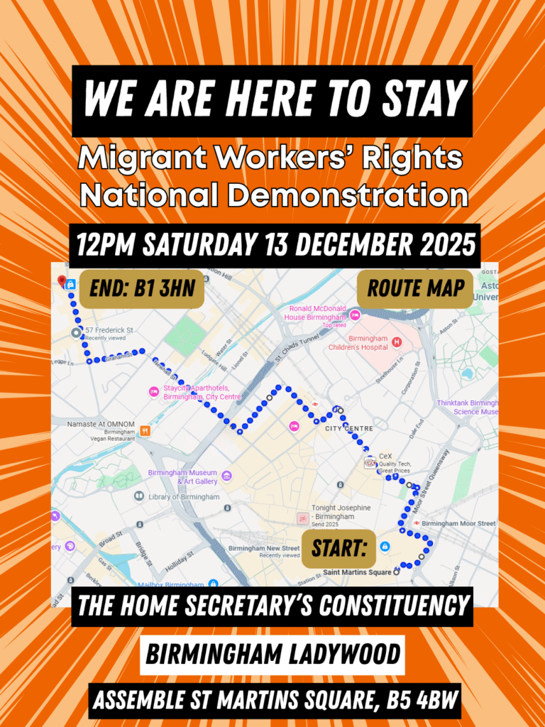 The Migrant Workers’ Rights National Demonstration is taking place in Birmingham on Saturday 13 December to demand justice, dignity and rights for all migrants.